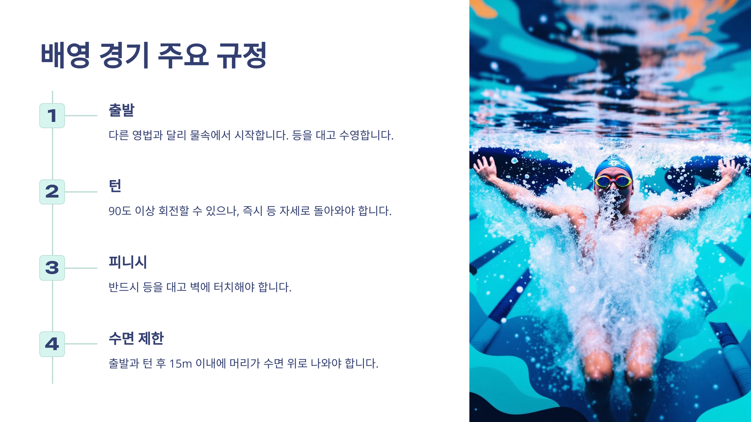 두 번째 규정은 '배를 계속 위로 향해야 한다'는 거예요. 턴할 때만 몸을 뒤집어서 배를 바닥으로 돌릴 수 있고, 그 외에는 절대 안 돼요. 턴 전 배를 돌리는 타이밍을 너무 빨리 잡아도 실격될 수 있어요! 🔄