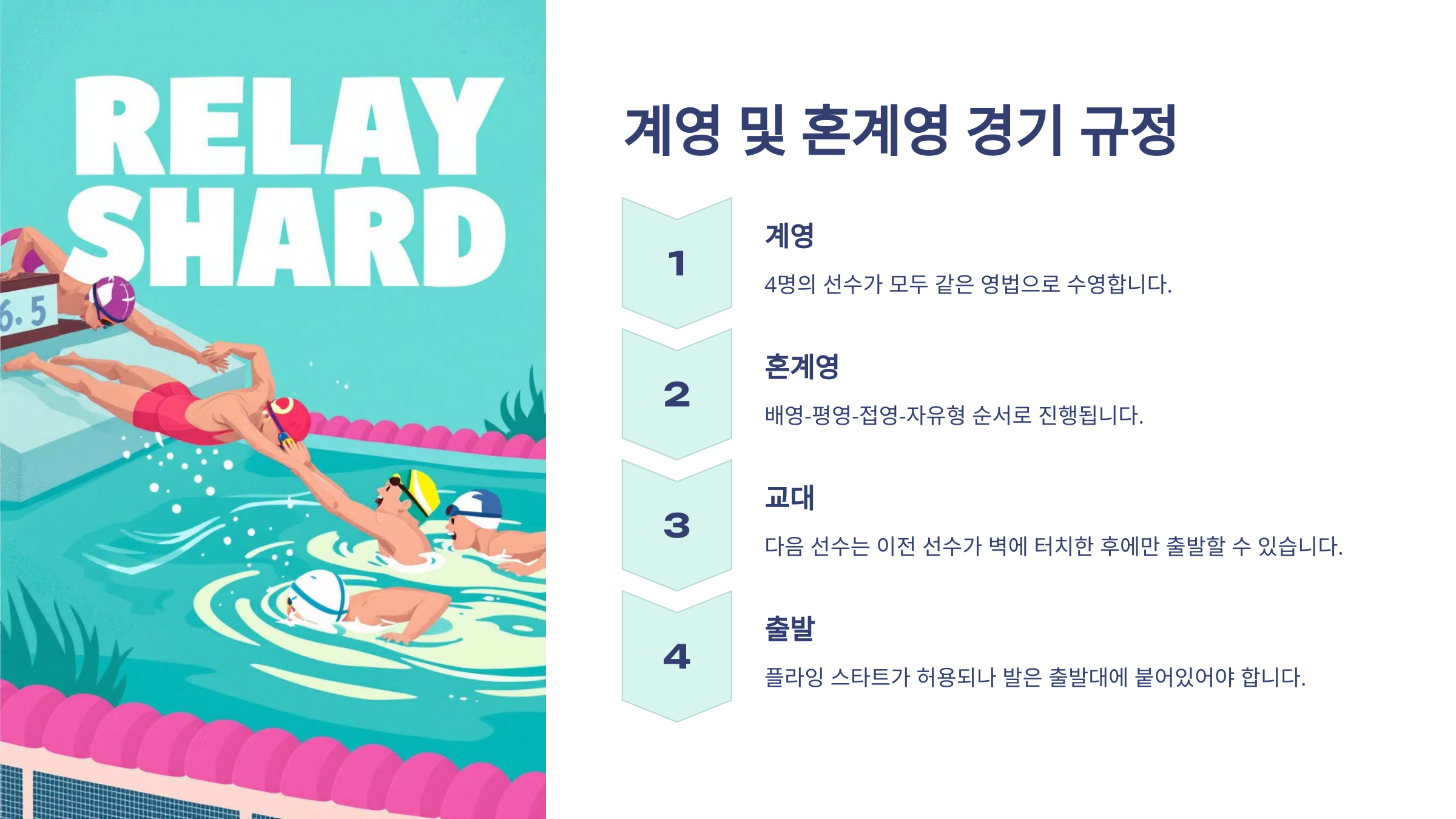계영과 혼계영은 팀워크가 핵심이에요! 모든 팀원이 규정을 숙지하고 연습하면 완벽한 릴레이로 1등도 충분히 가능하답니다! 🏆