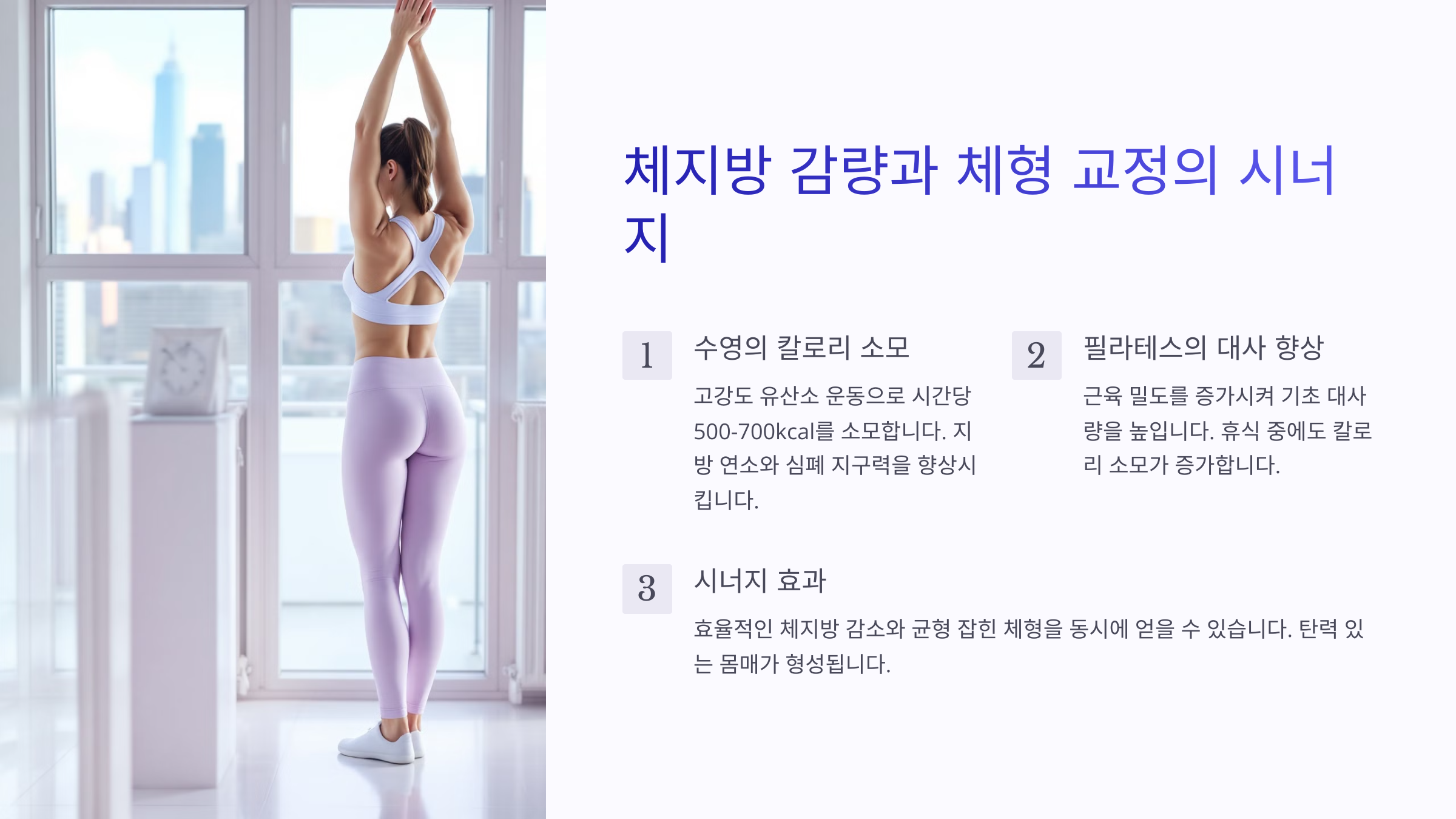 🔥 수영과 필라테스를 병행하면 체지방 감량은 물론이고, 체형 교정까지 한 번에 해결할 수 있어요! 두 운동의 조합은 지방을 태우고 근육을 단단하게 만들어 슬림하고 탄탄한 몸매를 완성해줘요 😊