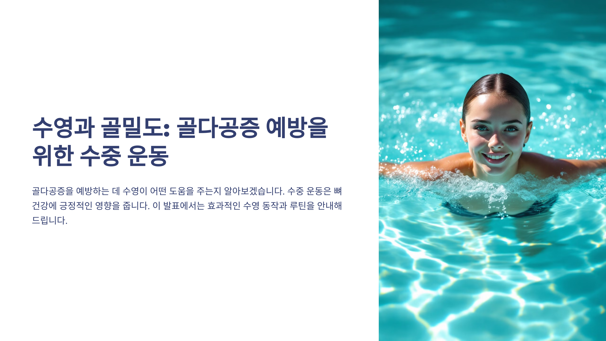 이제 수영이 왜 골다공증 예방에 효과적인지, 어떻게 운동하면 뼈 건강을 지킬 수 있는지 하나씩 자세히 알아볼게요!