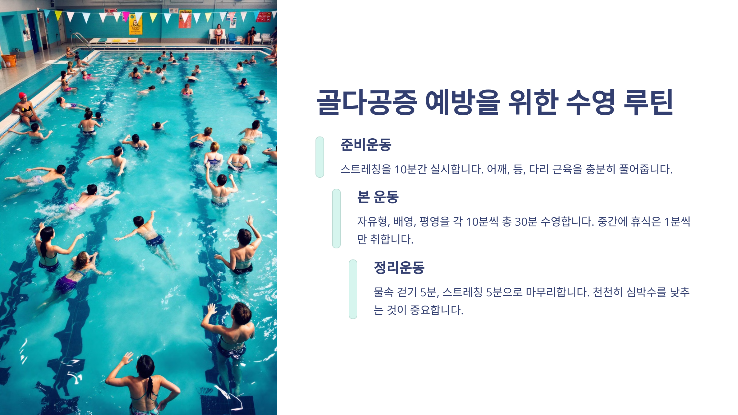 📅 골다공증 예방을 위해 수영 루틴을 체계적으로 짜는 게 정말 중요해요! 규칙적으로 실천하면 뼈가 튼튼해지고 골밀도가 유지되는 효과를 확실히 볼 수 있어요 😊