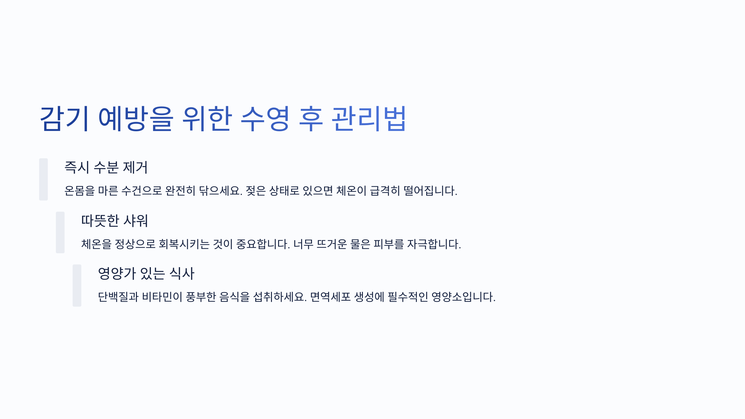수영 후 관리를 잘해야 감기를 확실히 예방할 수 있어요! 수영장에서 나와서 바로 따뜻한 물로 샤워하는 게 첫 번째예요. 체온이 떨어지지 않게 빠르게 물기를 제거하는 게 핵심이에요.