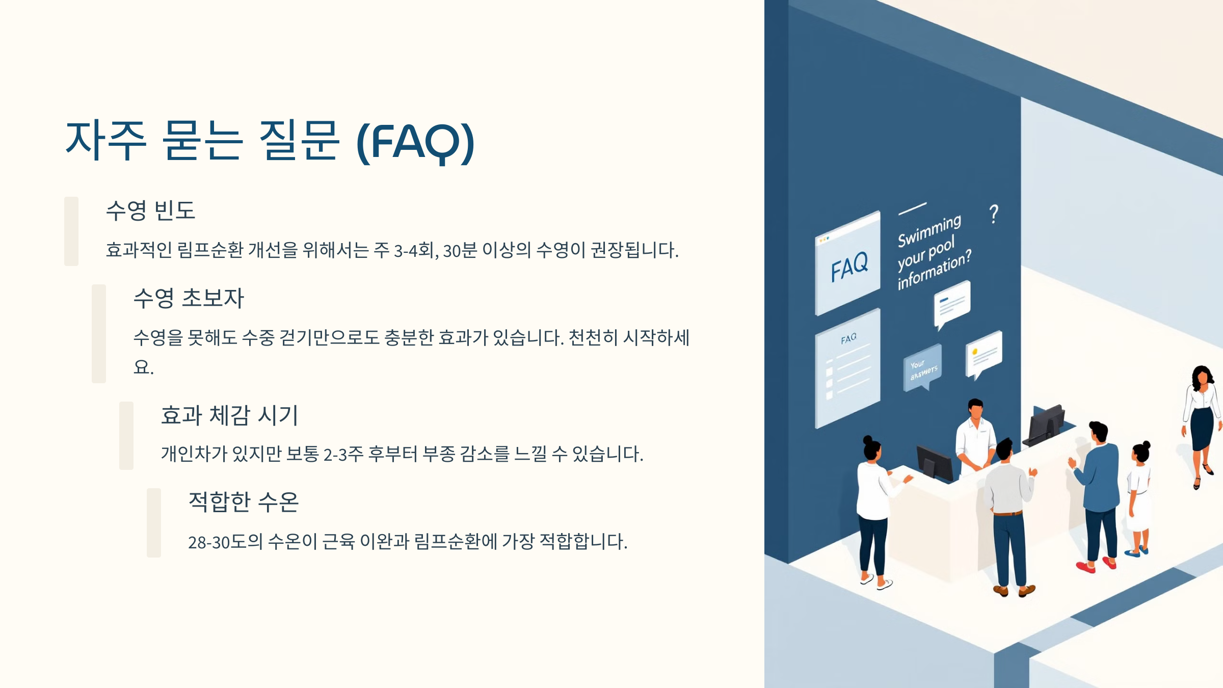 림프 순환이 원활하지 않으면 피로감이 심하고 몸이 자주 붓거나 무거워요. 수영을 주 2~3회 꾸준히 하면 이런 증상이 개선된다는 걸 많은 사람들이 경험하고 있어요. 저도 수영한 후 다리 피로가 사라지는 걸 확 느꼈거든요!