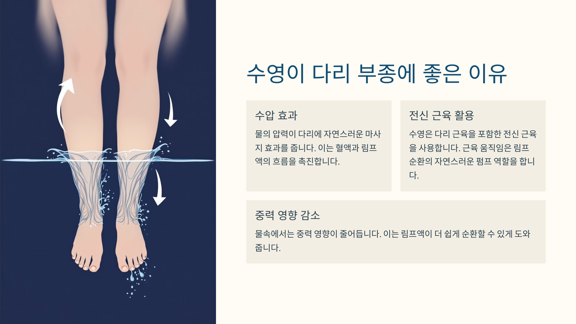 그런데 수영은 림프액이 잘 흐르도록 도와주는 효과적인 운동이에요. 물속에 들어가면 수압이 다리와 팔, 전신에 골고루 작용해서 림프와 혈액이 심장 쪽으로 잘 흐르게 도와줘요. 이게 바로 부종이 줄어드는 핵심 원리죠!