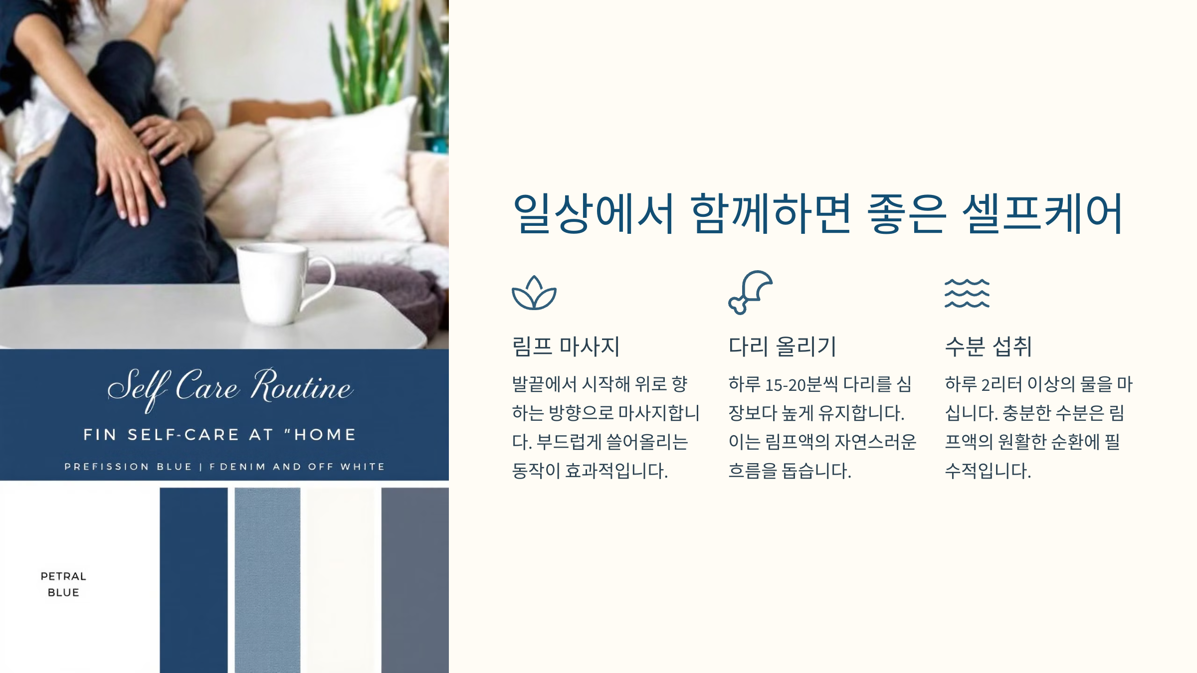🦵 수영으로 다리 부종을 완화하는 것도 좋지만, 일상생활에서 림프순환을 돕는 셀프케어를 함께 하면 효과가 훨씬 빨라져요! 수영장에 가지 않는 날에도 집이나 사무실에서 간단하게 실천할 수 있는 방법들을 정리했어요 😊