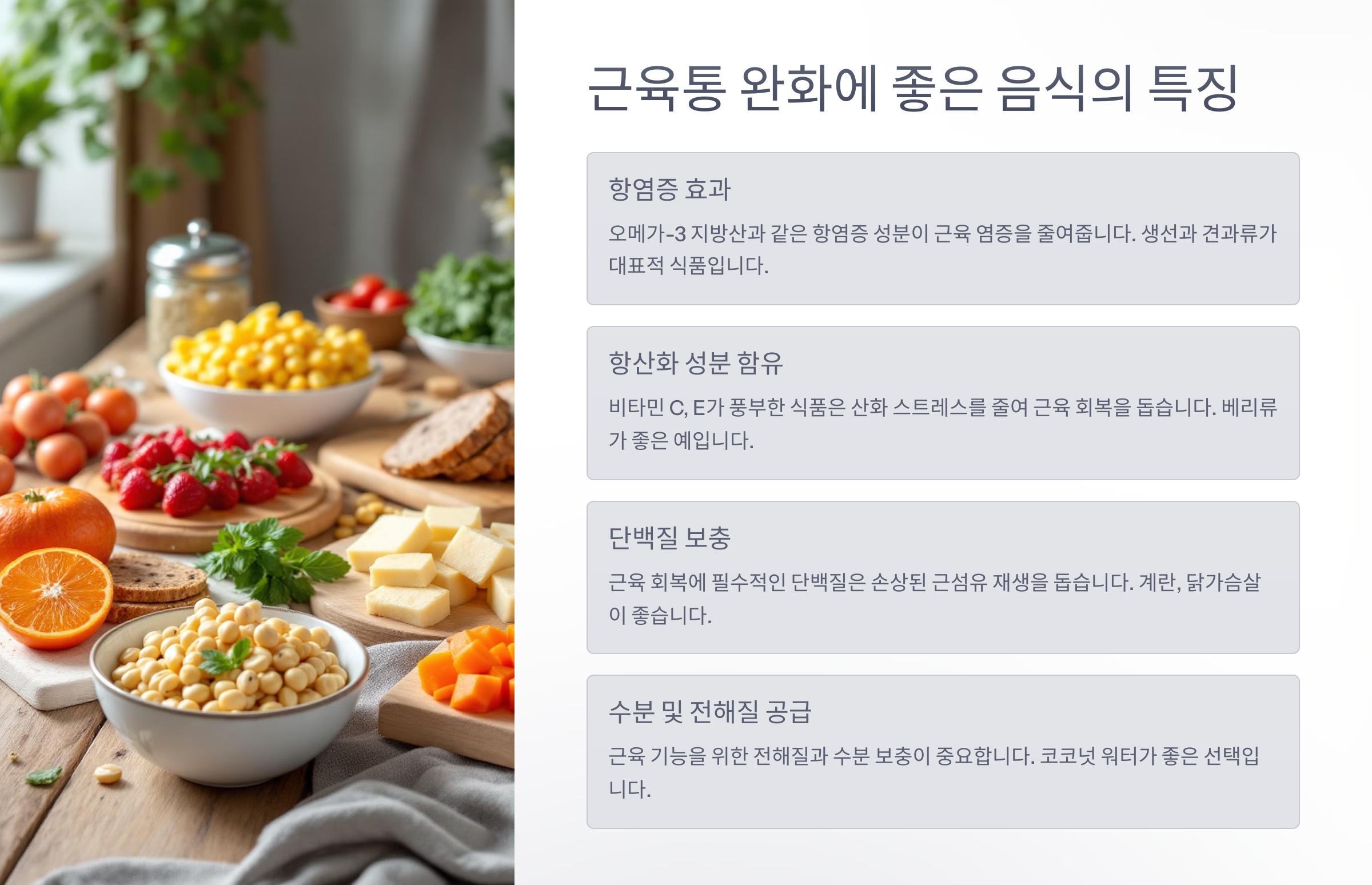 근육통을 완화하는 음식은 기본적으로 '염증을 줄이고', '근육 회복을 돕는' 기능이 있어야 해요. 이 두 가지가 동시에 충족될 때 통증이 확 줄어들고 회복이 빨라지거든요! 💪