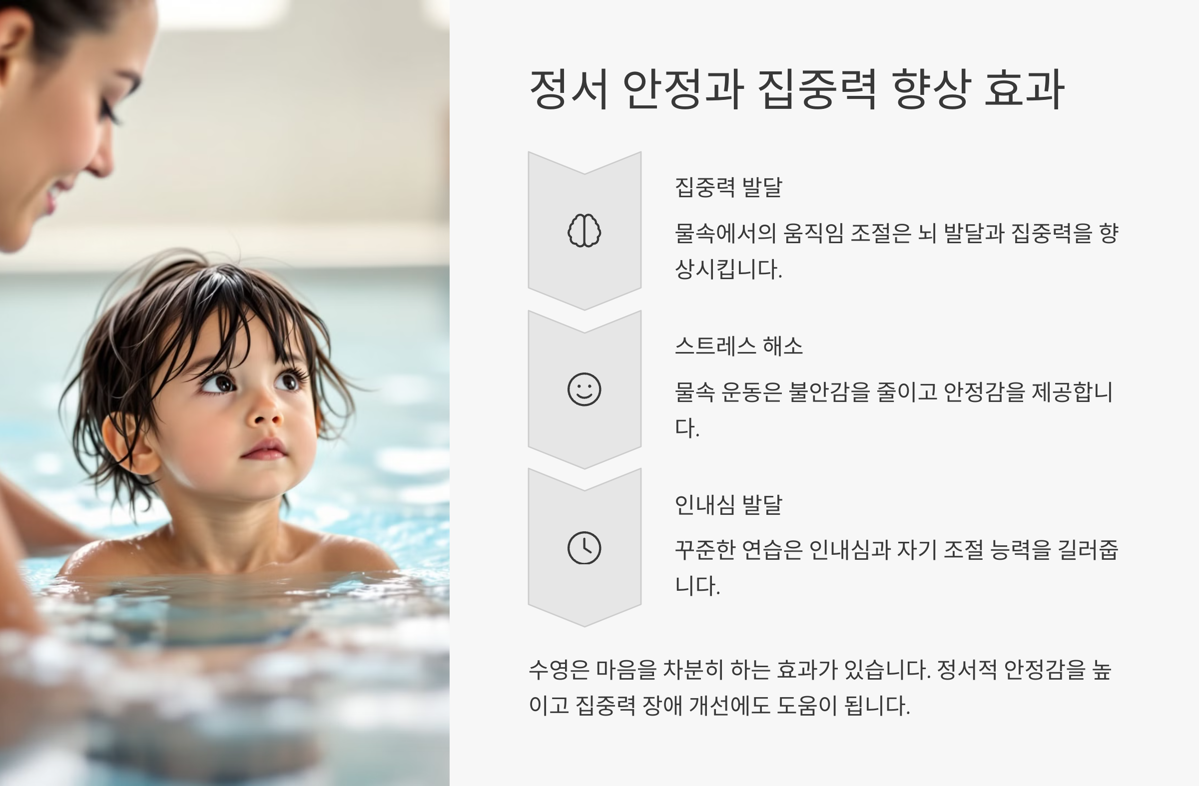 수영을 하는 동안 아이들은 집중해서 호흡과 동작을 맞춰야 하기 때문에 자연스럽게 집중력과 인내심이 길러져요. 실제로 수영을 꾸준히 하는 아이들은 학습 집중력도 높아진다는 연구 결과가 있어요! 😄