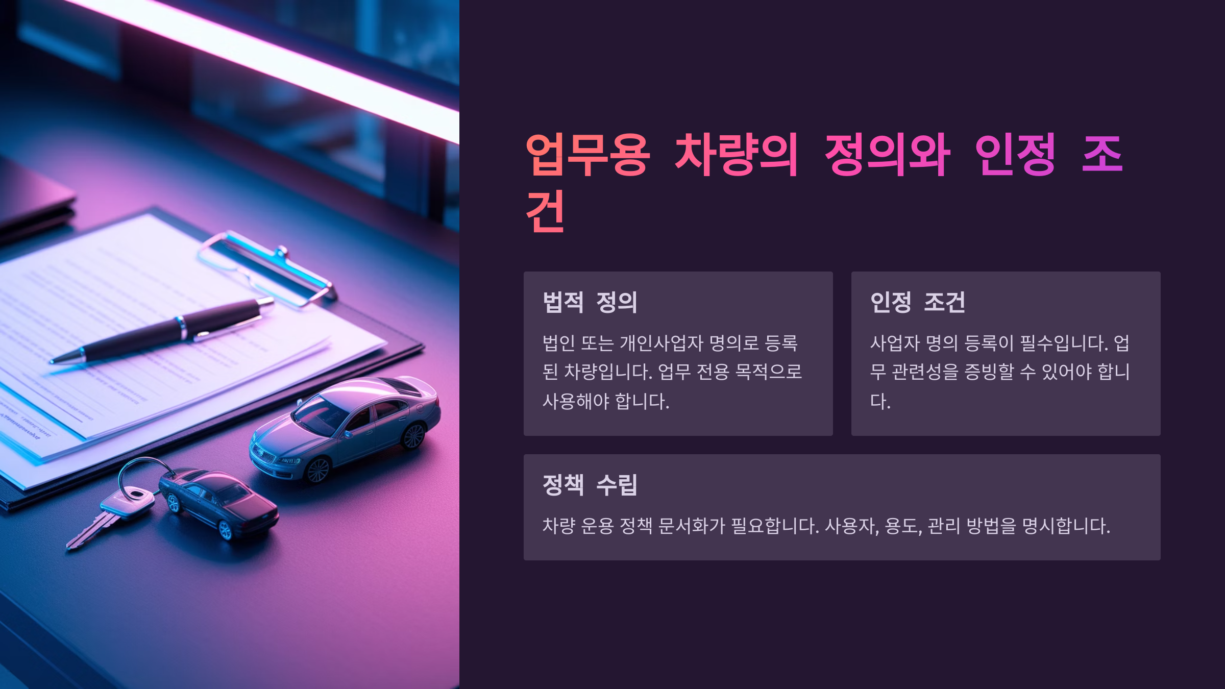 업무용 차량이란 법인 또는 개인사업자가 사업과 관련된 용도로 사용하는 차량을 말해요. 단순히 사업자 명의로 등록됐다고 업무용으로 인정받는 건 아니고, 실제 사용 내역이 중요해요.