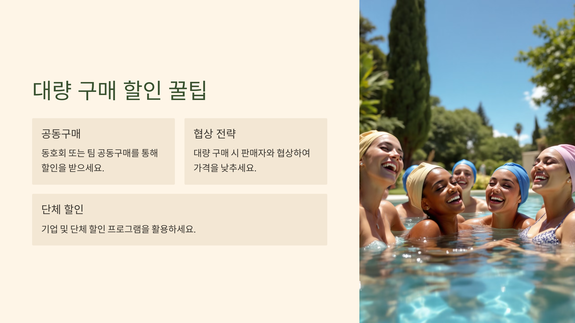 A4. 수영 동호회나 학교 단체로 브랜드와 직접 제휴를 맺으면 추가 할인을 받을 수 있어요. 5개 이상 구매 시 단체 할인은 대부분 적용됩니다.