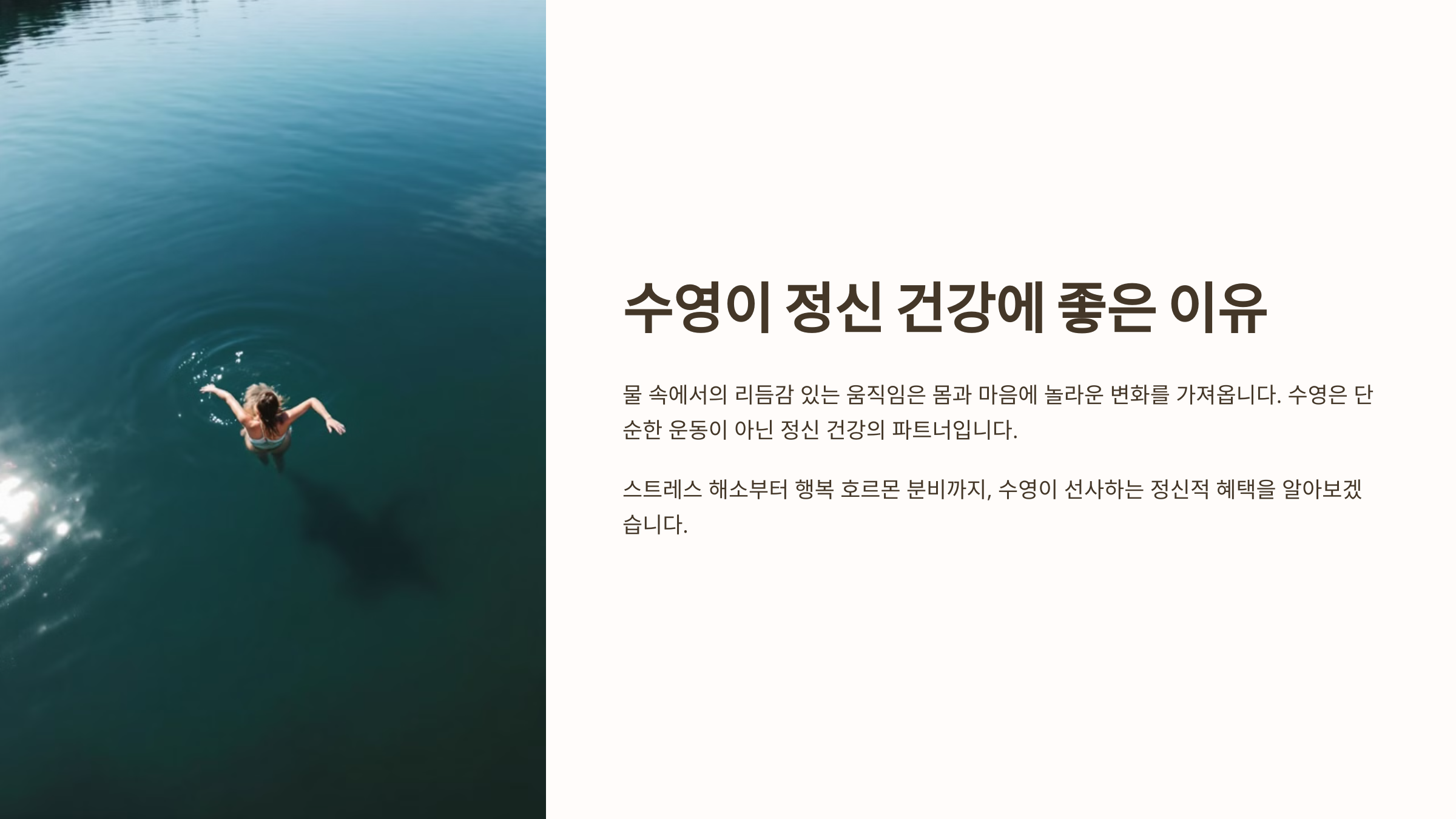 그럼 지금부터 수영이 왜 정신 건강에 좋은지, 스트레스 해소에 어떤 영향을 주는지 하나씩 자세히 알아볼게요!