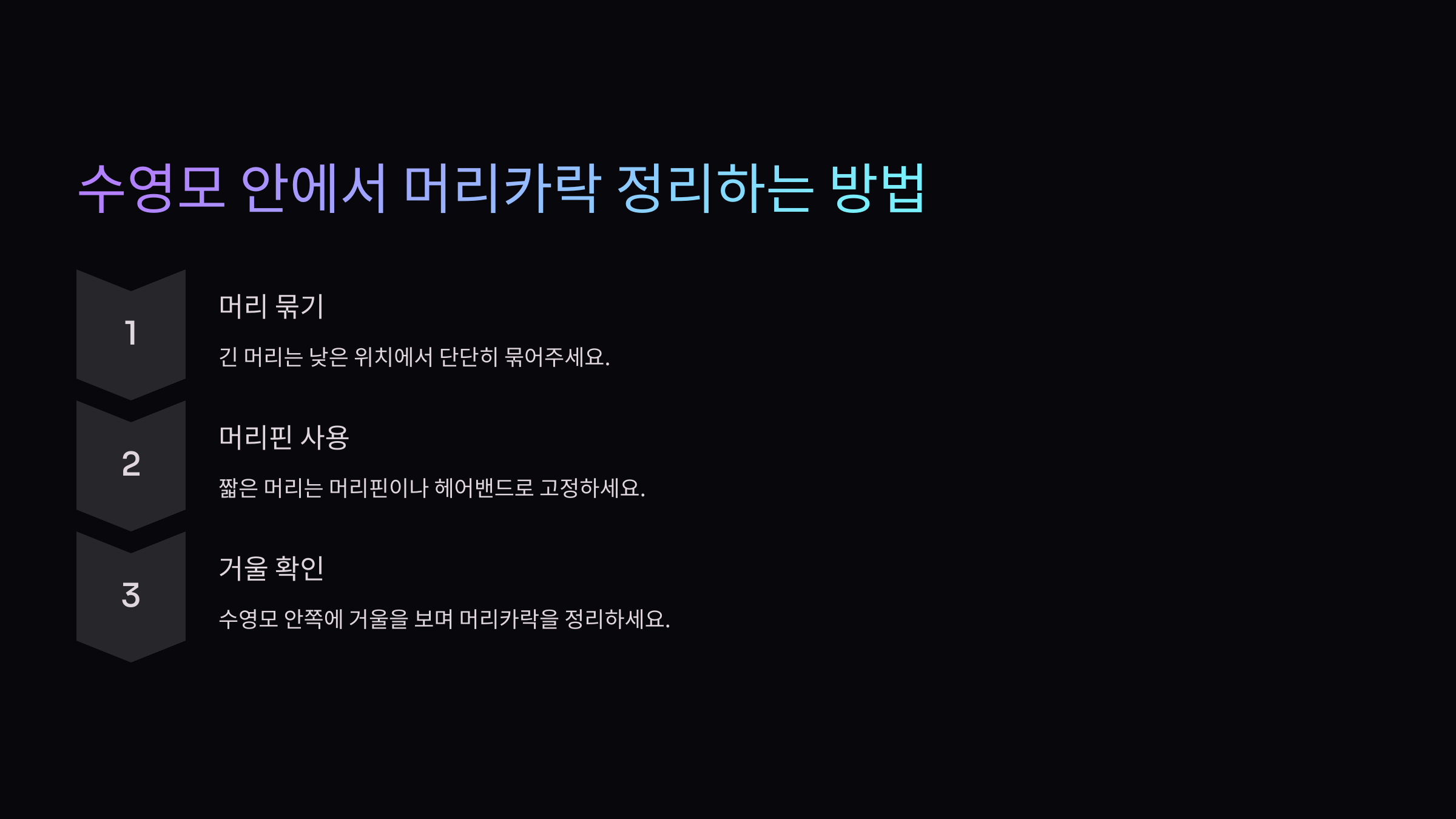 가장 기본적인 방법은 머리를 묶는 거예요. 하지만 너무 높이 묶으면 수영모가 들릴 수 있기 때문에, 머리끈을 이용해 낮게 묶는 것이 좋아요. 뒤통수 중앙보다 약간 아래쪽에 묶으면 수영모 착용 시 안정감이 있어요.