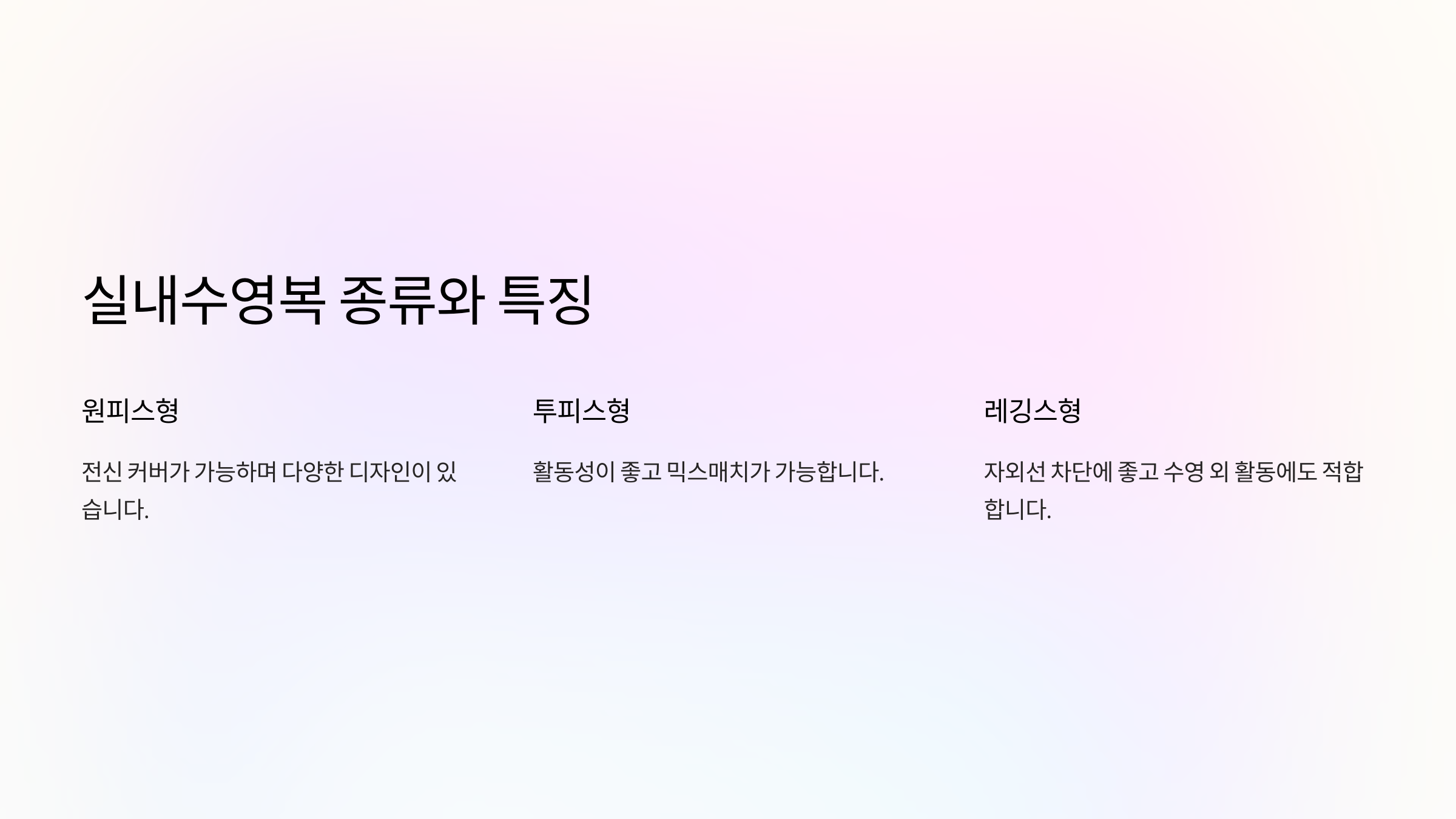 실내수영을 즐기는 여성들에게 꼭 필요한 것이 바로 실내수영복이에요! 하지만 아무 수영복이나 샀다가는 불편하거나 금방 망가져 후회할 수도 있어요. 실내수영복은 디자인뿐만 아니라 재질, 핏, 기능성까지 꼼꼼하게 따져보고 골라야 해요.