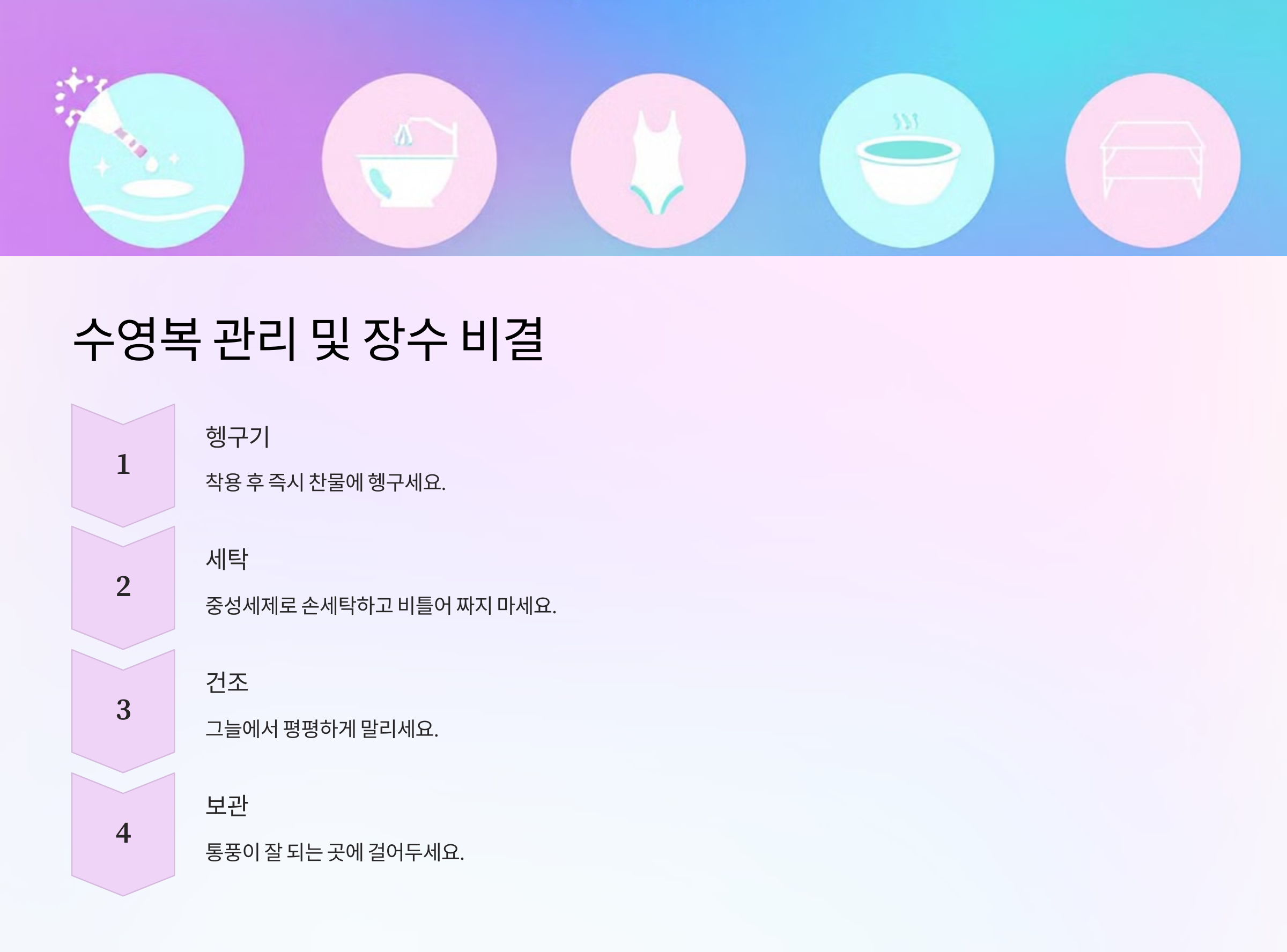 수영 후에는 수영복을 흐르는 물에 헹궈 염소 성분을 제거해야 해요. 염소는 소재를 손상시키는 주범이기 때문에 필수 과정이에요!