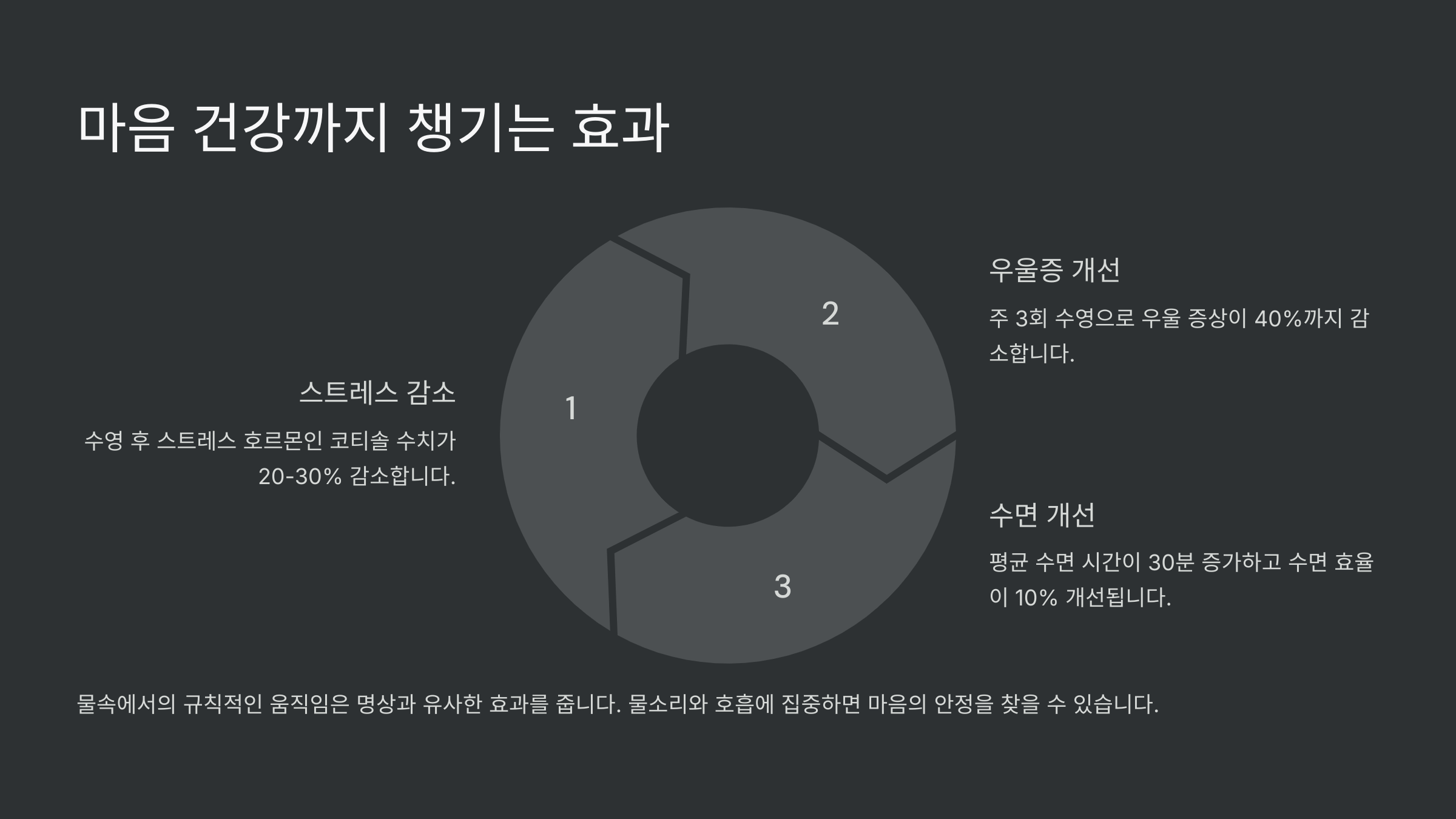 정신 건강이 좋아지면 몸도 함께 좋아지는 건 누구나 아는 사실이죠! 수영은 몸과 마음을 동시에 건강하게 만들어주는 정말 최고의 운동이에요. 특히 50대 이후 새로운 도전을 하고 싶은 분들에게 추천하고 싶어요! 🏊♂️