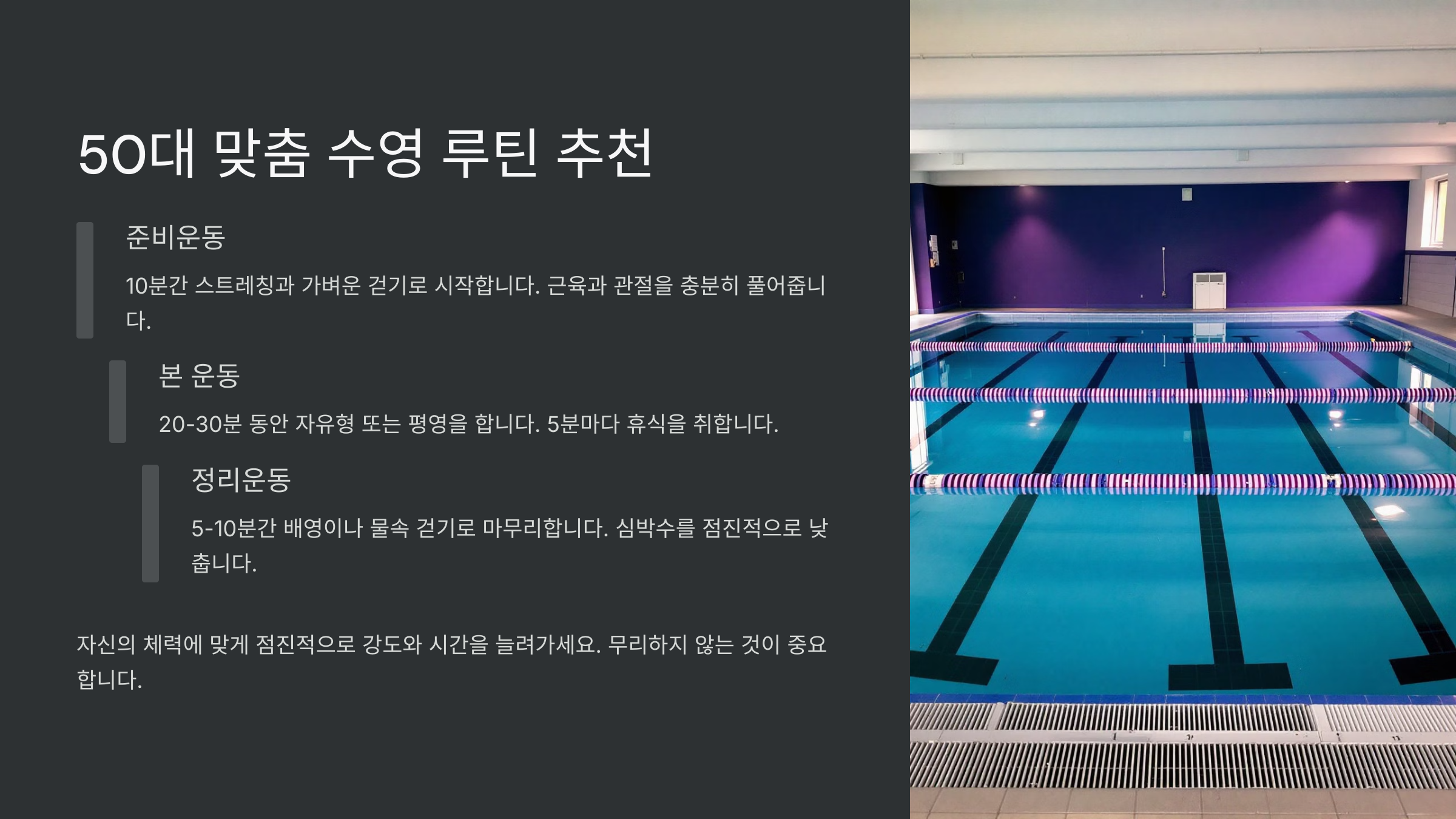 50대 이후 수영을 시작할 땐, 무리하지 않고 천천히 몸에 맞게 루틴을 짜는 게 정말 중요해요! 체력이 갑자기 좋아지는 건 아니니까, 내 몸을 잘 관찰하면서 점진적으로 강도를 높이는 게 핵심이랍니다. 😄