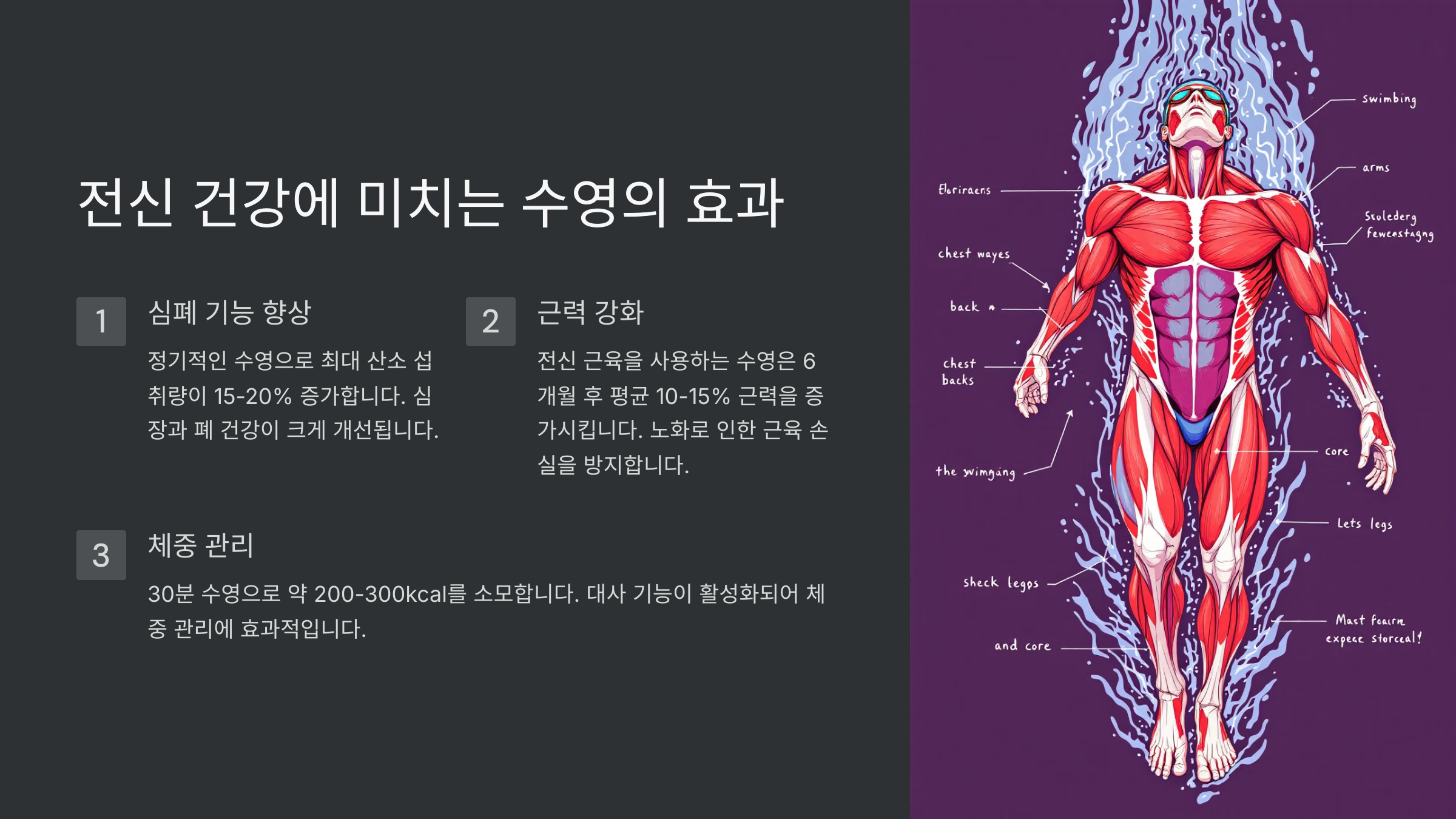 수영은 전신을 사용하는 운동이라서 몸 전체에 골고루 좋은 영향을 줘요! 특히 50대 이후에는 근육량이 자연스럽게 줄어드는데, 수영은 이런 근손실을 예방하고 체력을 끌어올려 주는 효과가 있어요. 물속에서 운동하기 때문에 무릎이나 허리 부담도 적고요! 😄