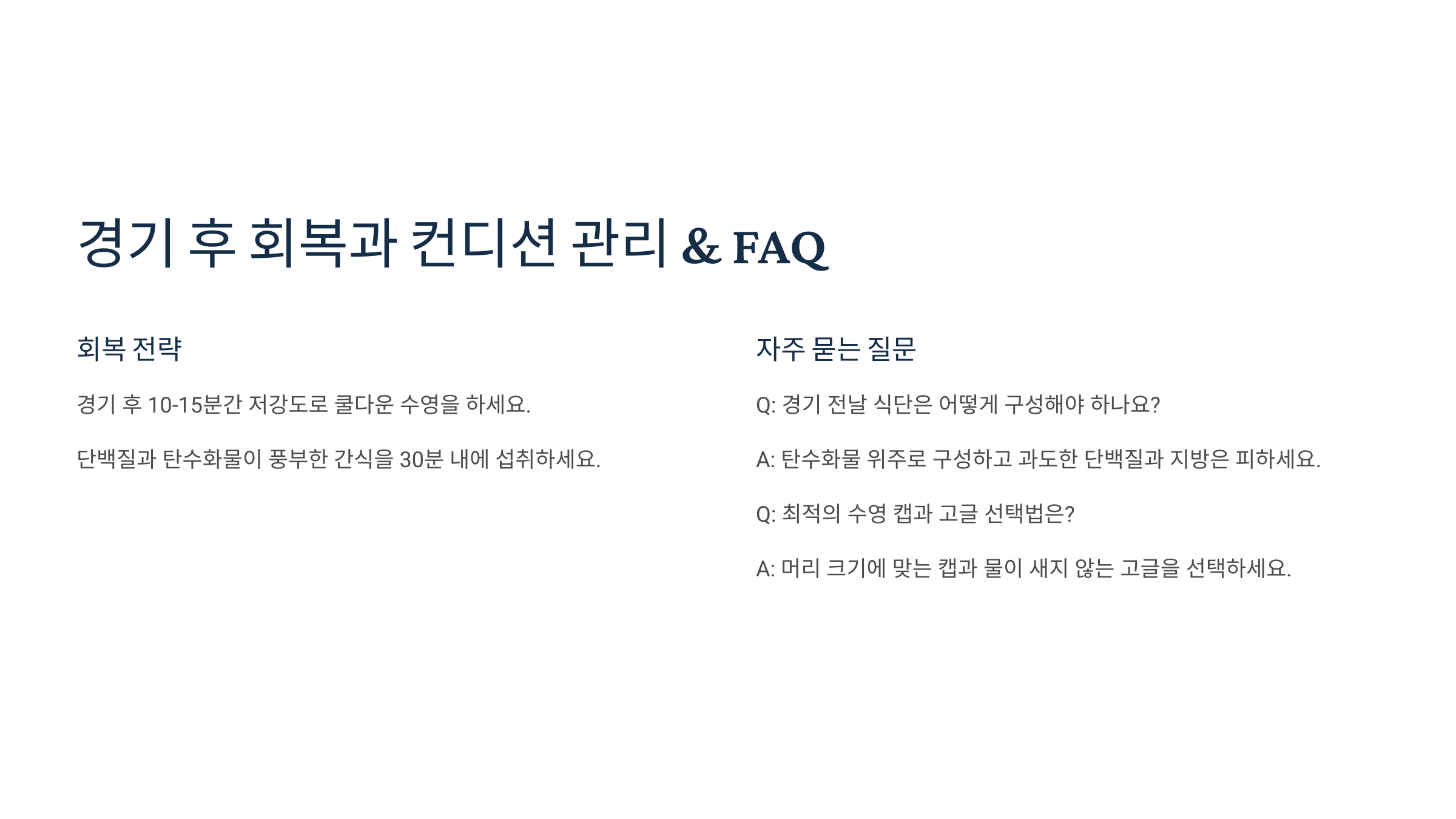 가장 먼저 해야 할 건 쿨다운 수영이에요. 레이스가 끝난 후 바로 풀을 나가면 근육이 굳고 피로가 더 쌓일 수 있어요. 천천히 200~400m 정도 가볍게 수영하면서 심박수를 안정시키는 게 좋아요. 심호흡과 함께 부드럽게 움직이면 회복이 빨라져요! 🏊♀️