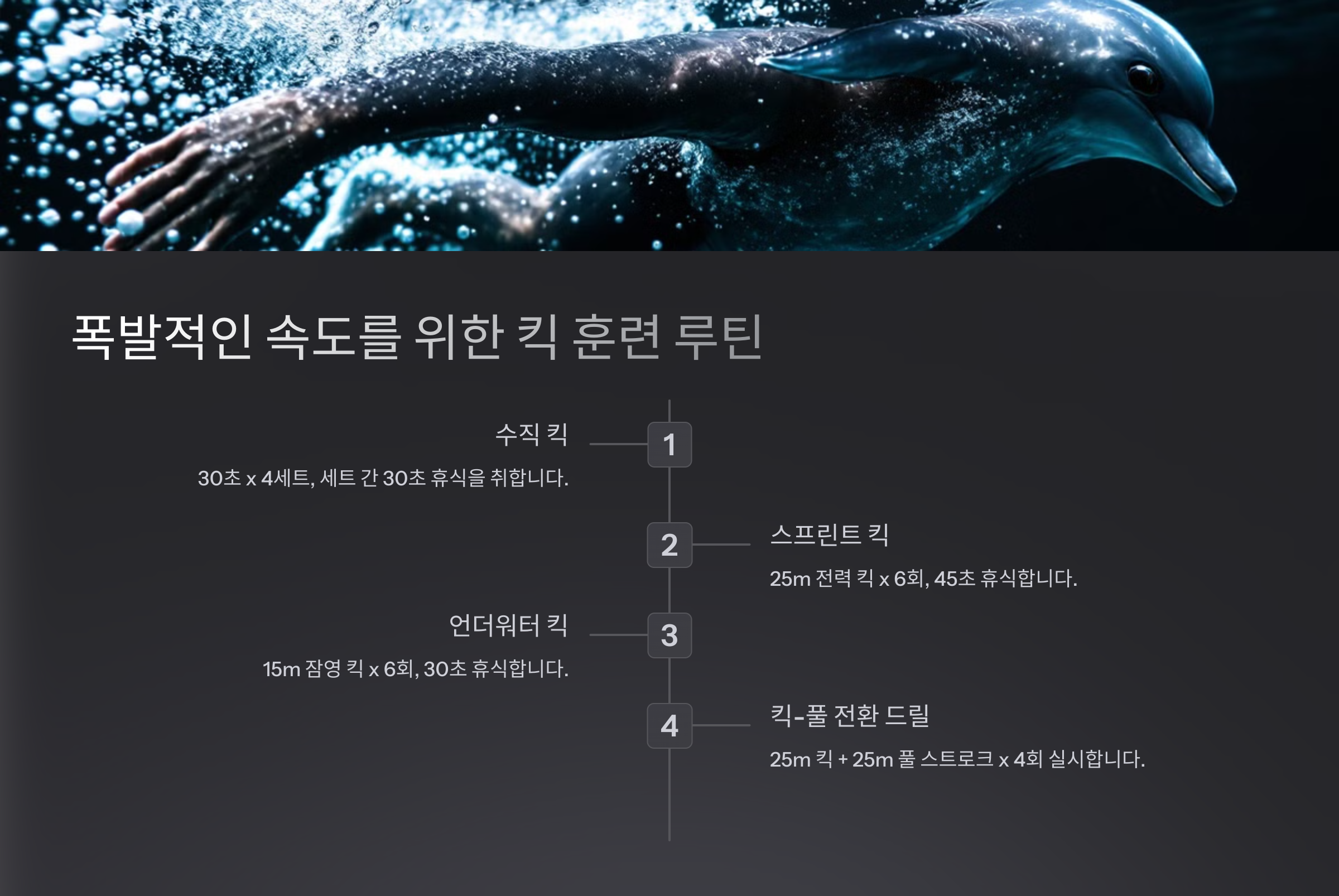 | 자유형 킥보드 킥 | 무릎 고정, 발끝 차기, 속도 유지 | 50m × 8세트 |