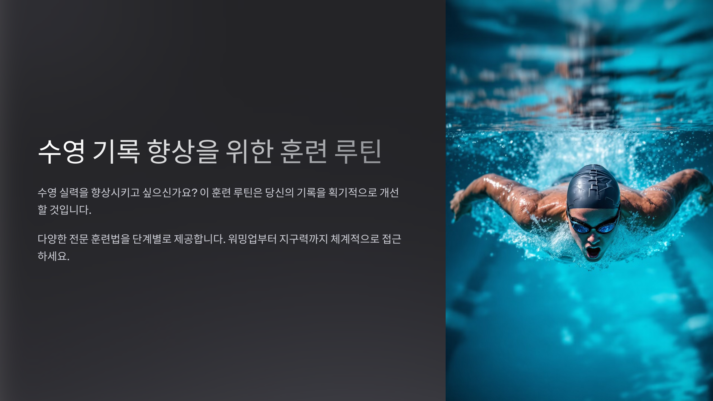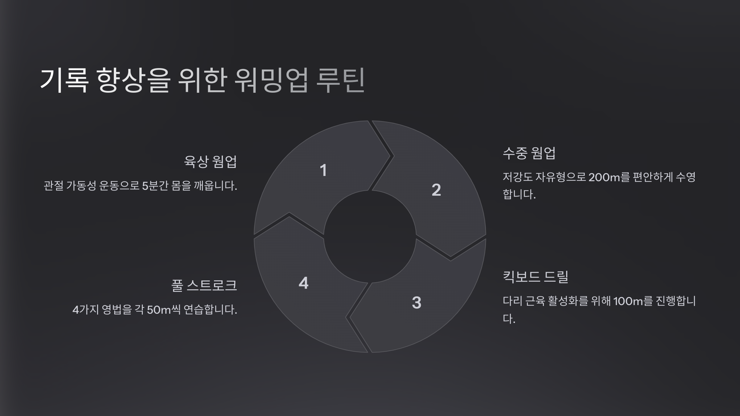 그럼 지금부터 기록 단축을 위한 훈련 루틴, 하나씩 살펴보겠습니다! 준비되셨죠? 🏊♀️