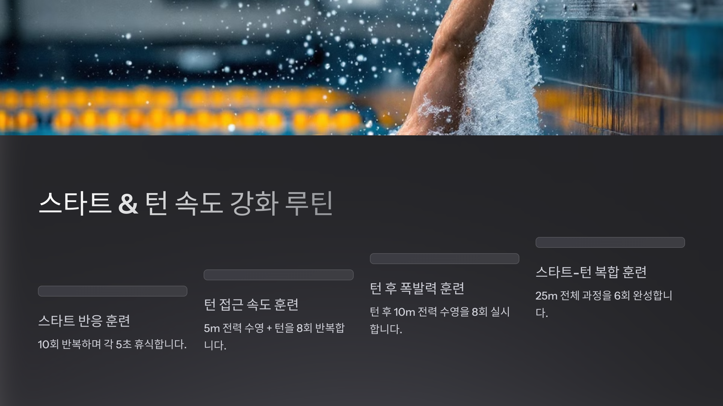 | 턴 훈련 (플립/양손) | 벽 밀어내기 + 빠른 돌핀킥 연계 | 50m 반복, 10세트 |