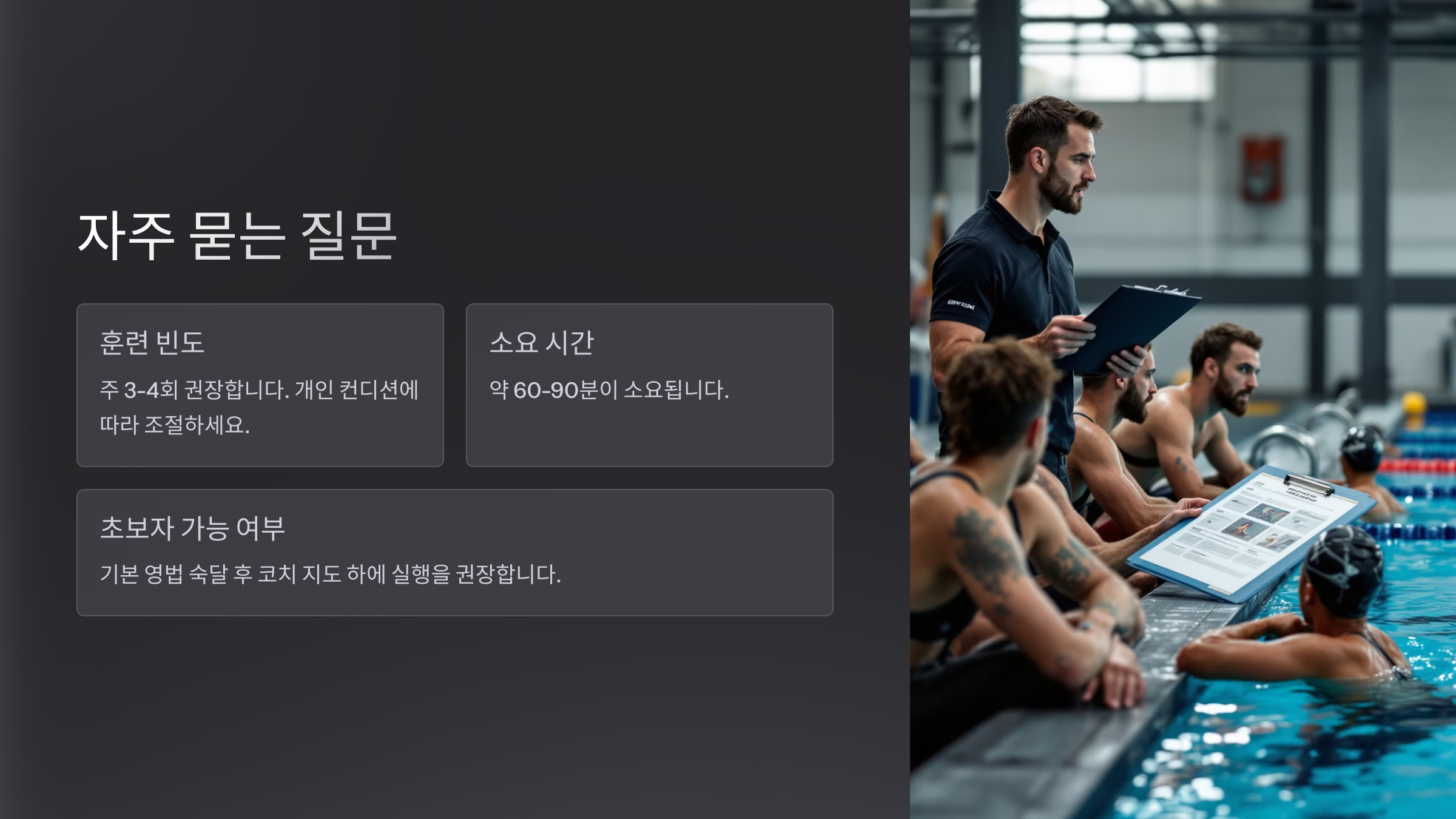 | 돌핀킥 훈련 | 입수 후 수중 15m 돌핀킥 유지 | 15m × 8세트 |