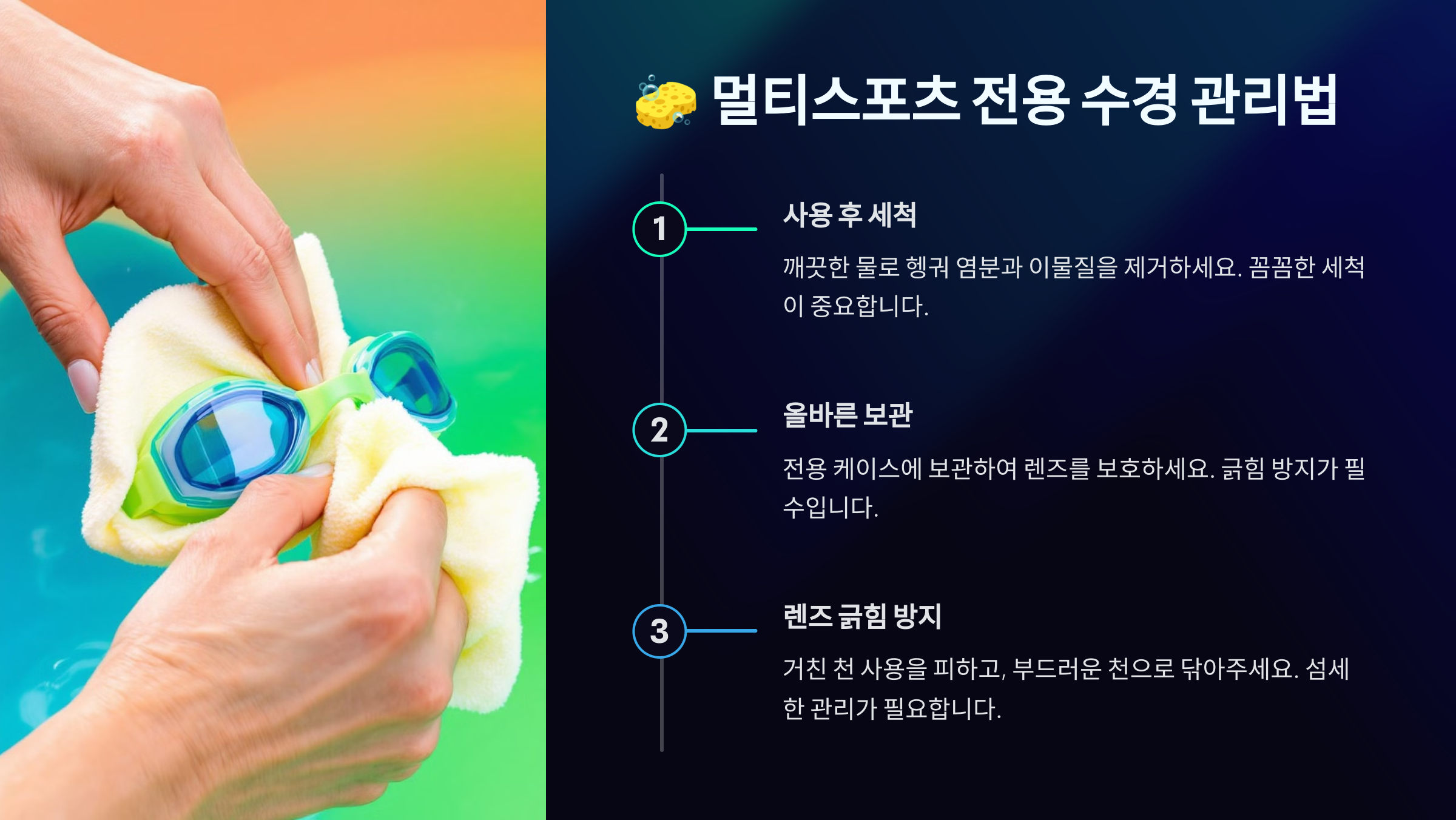 멀티스포츠용 수경은 관리만 잘하면 1년 이상 충분히 쓸 수 있어요! 고가의 트라이애슬론 전용 수경일수록 케어가 중요하니까, 확실하게 관리하는 방법을 알려줄게요 🛠️