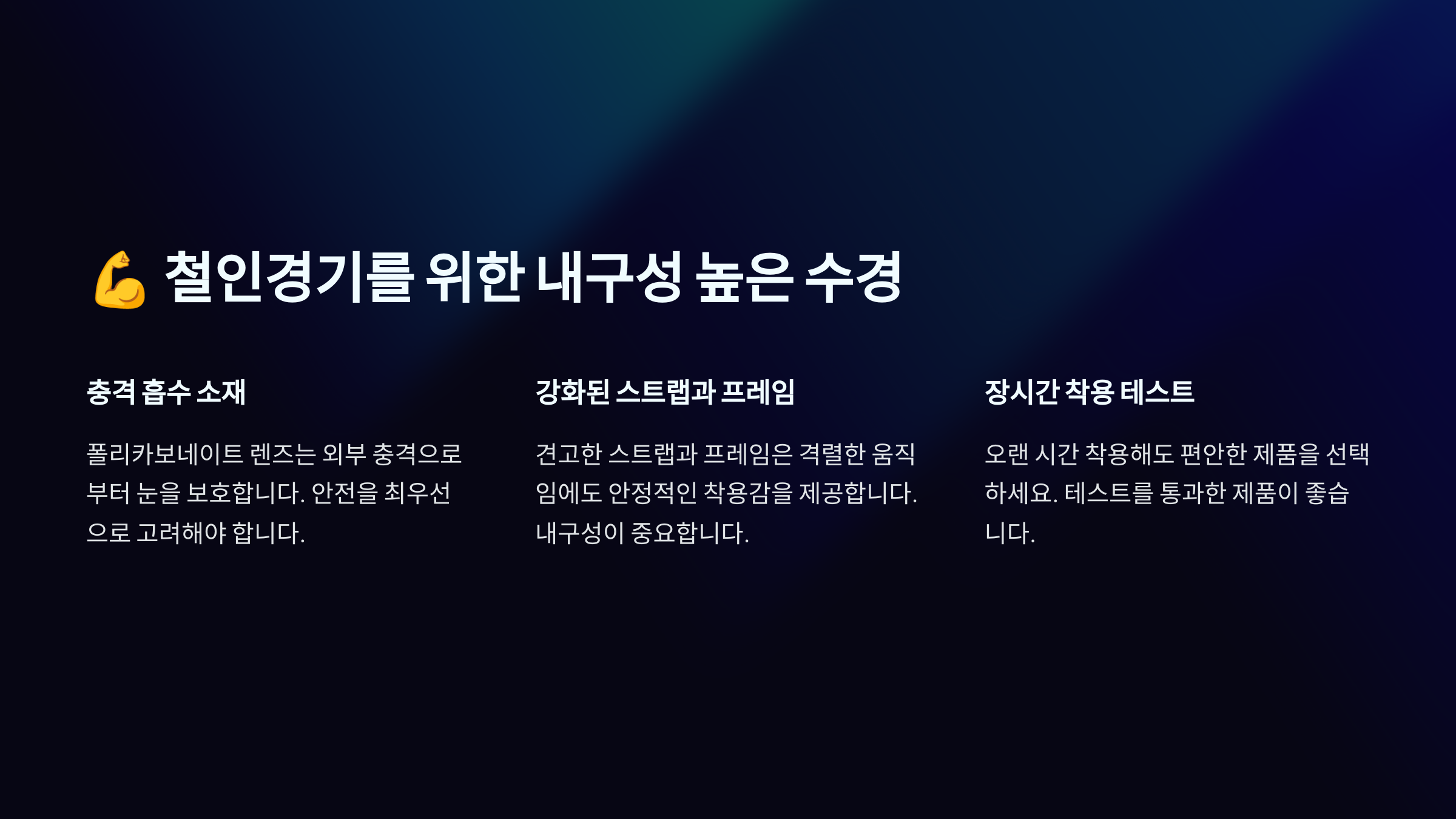 철인경기는 극한의 체력과 정신력을 요구하는 스포츠라 장비도 그만큼 내구성이 중요해요! 특히 수경은 바다, 강, 호수 등 다양한 환경에서 오랜 시간 동안 안정적인 성능을 유지해야 하죠 😎