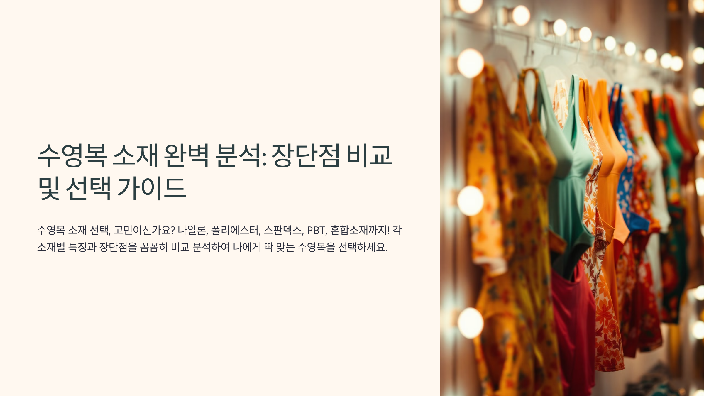 내가 생각했을 때, 수영복을 오래 입으려면 소재를 잘 선택하는 게 가장 중요해요. 수영복 소재마다 특징이 다르기 때문에, 자신의 수영 스타일과 사용 환경에 맞는 소재를 고르는 게 핵심이죠. 오늘은 여자 실내수영복의 대표적인 소재 5가지와 유지관리 방법까지 꼼꼼히 알려줄게요! 🏊♀️