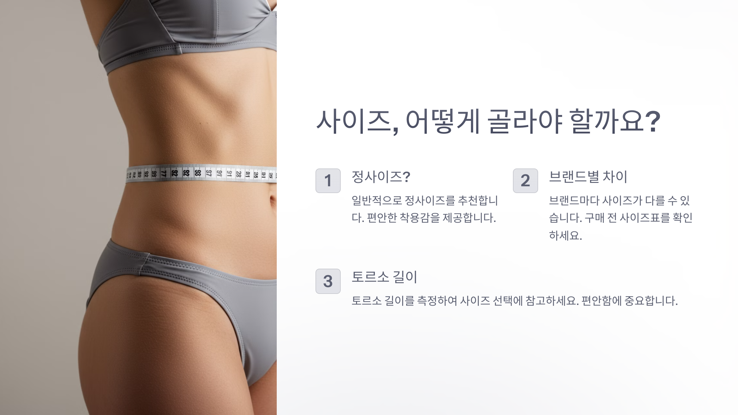 | 엉덩이 & 다리 라인 | 힙이 작으면 끼고, 크면 물속에서 뜰 수 있어요. |